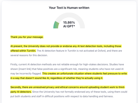 The tone of these messages is often anxious. Academics are trying to protect academic standards while navigating rapid technological change, and many are understandably looking for reassurance that there is a reliable way to identify AI-generated work.
