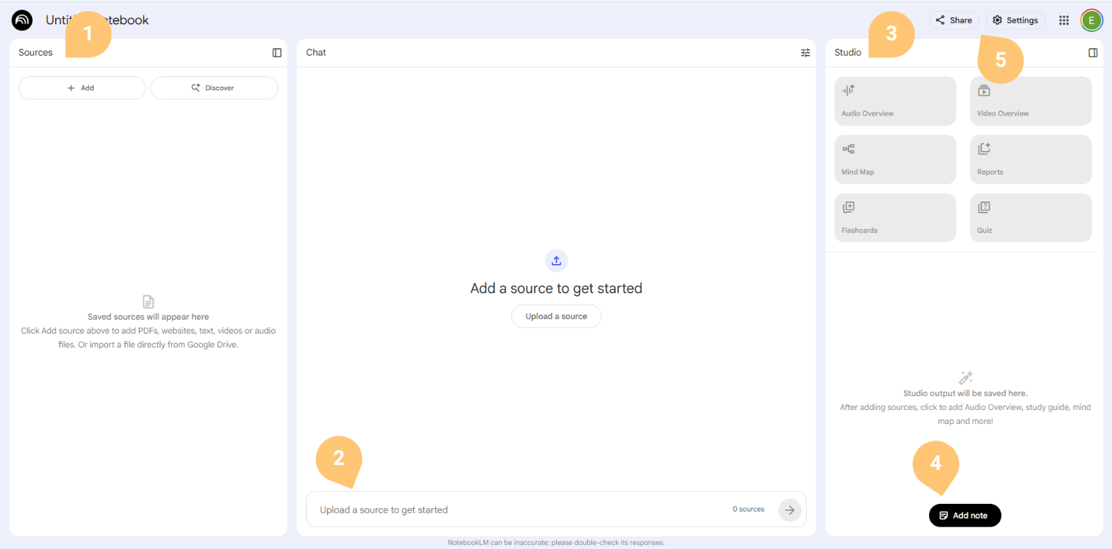 Sources Panel (left): ClickĀ AddĀ orĀ DiscoverĀ to upload PDFs, text files, websites, videos, or audio. This is where your reference materials live.